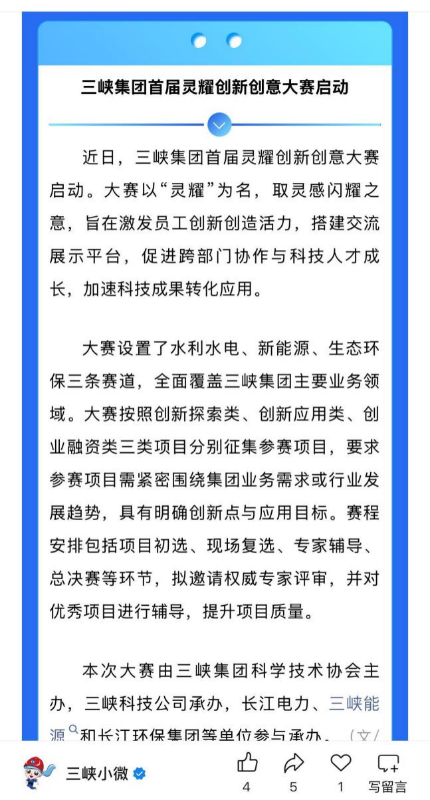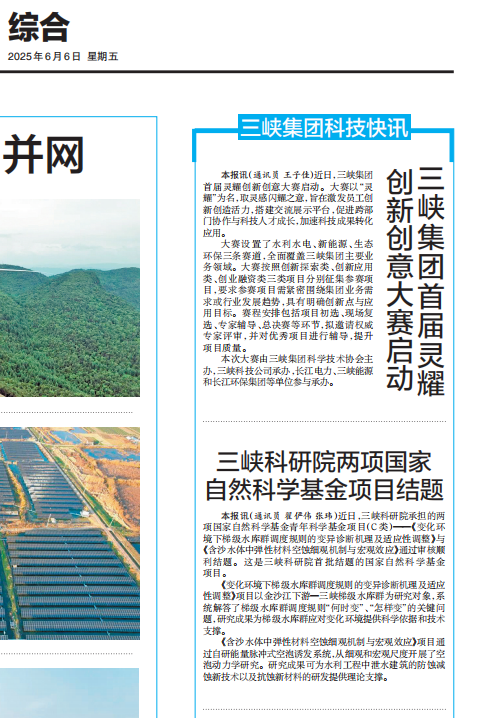 為深入學習貫徹習近平總書記關于科技創新的重要論述精神,貫徹落實創新驅動發展戰略,激發全集團員工創新創造活力,促進科技成果應用轉化,引領推動集團公司高質量發展,集團公司首屆靈耀創新創意大賽(以下簡稱靈耀大賽)已于5月23日正式啟動。本次大賽由三峽集團科協主辦,三峽科技主承辦。首屆靈耀大賽啟動得到了集團各媒體平臺的關注和報道。